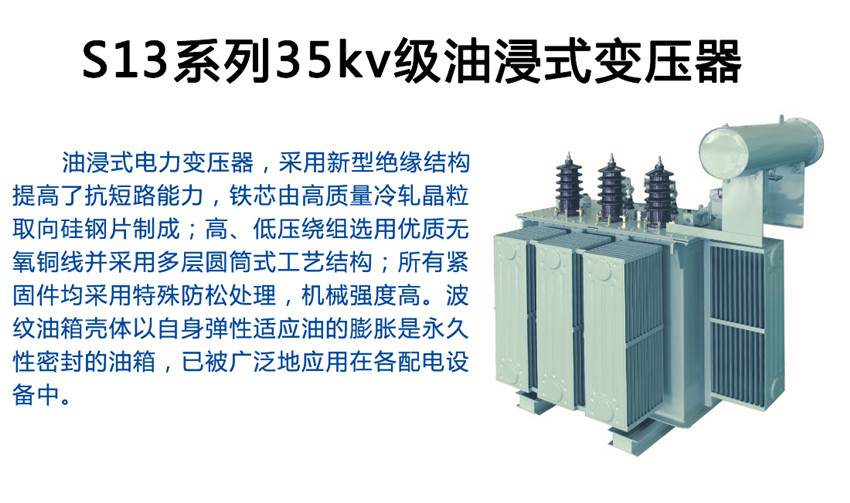 S13油浸式全密封配電變壓器,不同于普通油浸式變壓器,它取消了儲油柜,由油箱體的波紋板式散熱片來散熱冷卻,其彈性脹縮補償油體積的增減。各系列產品適用在10KV、20KV、35KV輸配電系統(tǒng)中,可供居民區(qū)、商業(yè)街道、工礦企業(yè)和農村動力及照明之用。